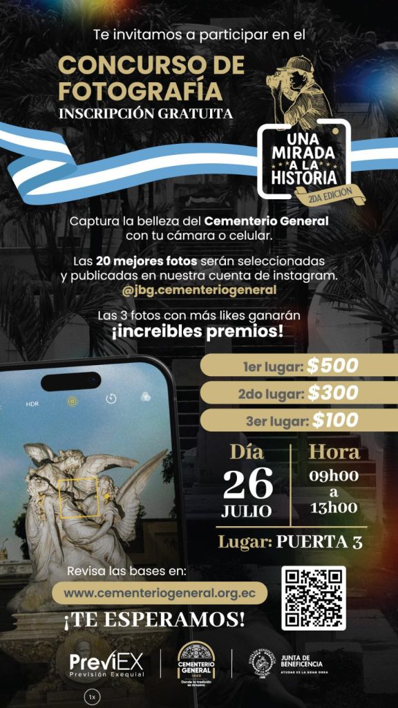 En homenaje a los 490 años de la Fundación de Guayaquil, el Cementerio General de la Junta de Beneficencia invita a la ciudadanía a participar de la segunda edición del Concurso Express de Fotografía “Una Mirada a la Historia”, una experiencia creativa de un solo día que busca resaltar el valor patrimonial, artístico y humano del Cementerio General, ícono de la ciudad y testigo de su memoria.